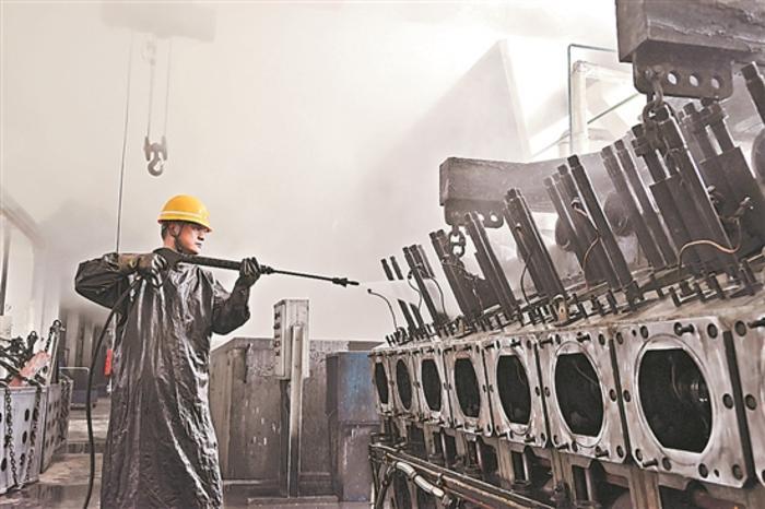 在中國(guó)鐵路鄭州局集團(tuán)有限公司新鄉(xiāng)機(jī)務(wù)段機(jī)車配件清洗庫(kù)內(nèi),有3個(gè)大小不一的清洗池,水溫高達(dá)100攝氏度,清洗工需要在悶熱潮濕的環(huán)境中作業(yè),徹底清洗配件內(nèi)的油泥、積碳等雜質(zhì),以確保機(jī)車配件質(zhì)量。圖為配件清洗工對(duì)高溫煮洗后的機(jī)體進(jìn)行清洗。袁修航 攝