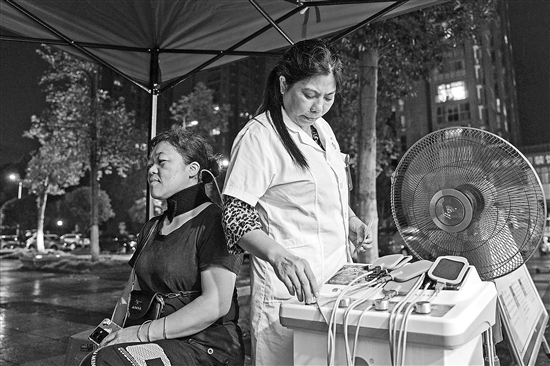 近日,湖南省常寧市衛(wèi)健局舉辦“中醫(yī)夜市”活動,醫(yī)護(hù)人員變身“夜市攤主”,現(xiàn)場展示針灸、推拿、刮痧、耳貼、艾灸等傳統(tǒng)技藝,免費(fèi)為群眾提供健康咨詢和診療服務(wù),吸引了眾多市民前來“探店”。圖為醫(yī)護(hù)人員為市民做理療。新華社記者 陳思汗 攝