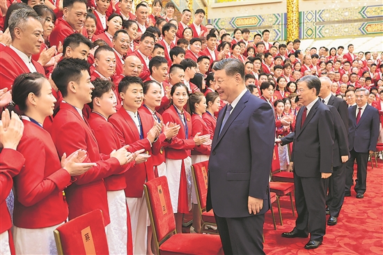 在熱烈的掌聲中,習近平發(fā)表重要講話。他表示,中國體育代表團的優(yōu)異成績,既是我國體育事業(yè)發(fā)展進步的集中體現(xiàn),也是中國式現(xiàn)代化建設成就的一個縮影,充分彰顯了新時代中國力量。國運興則體育興、國家強則體育強。我國能夠躋身世界體育大國、奧運強國之列,根本在于綜合國力不斷增強,為體育競技訓練提供了先進科技支撐和堅實物質保障,也為各領域體育人才脫穎而出創(chuàng)造了良好成長環(huán)境和廣泛群眾基礎。新時代新征程,以中國式現(xiàn)代化全面推進強國建設、民族復興偉業(yè),必將為我國體育事業(yè)發(fā)展提供更好條件、注入強勁動力。我們要繼續(xù)大力發(fā)展以人民為中心的體育事業(yè),推動全民健身和全民健康深度融合,向著建設體育強國、健康中國的目標不斷邁進。