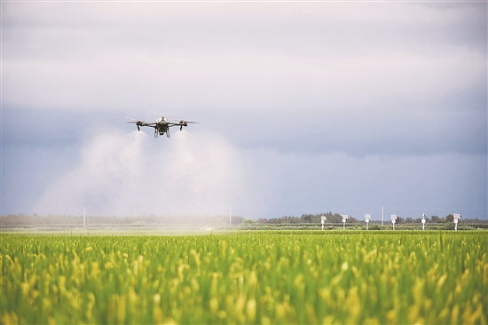 8月16日,在北大荒集團黑龍江八五六農場有限公司第六管理區(qū)水稻地塊,一架無人機在進行“一噴多促”作業(yè)。