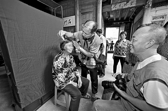為滿足偏遠山區(qū)農(nóng)村老人拍攝肖像照的需求,2020年以來,福建省寧德市周寧縣“歲月年輪”敬老攝影服務隊的60余名志愿者利用周末或者節(jié)假日,先后走遍了70余個偏遠山村,把攝影棚搬到村民家門口,免費為6700多名鄉(xiāng)村老人定格“最美笑容”。 圖為在李墩鎮(zhèn)樓坪村,周寧縣敬老攝影志愿者為老人拍攝肖像照做準備。