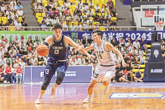 浙江稠州銀行隊球員張洪碩(左)在比賽中帶球突破。新華社記者 黃偉 攝