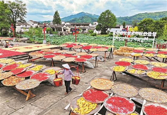 8月19日,安徽省黃山市徽州區(qū)呈坎村村民挑著農(nóng)作物去曬場上晾曬。