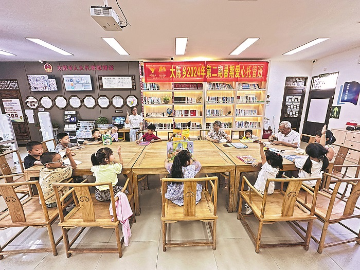 為讓留守兒童度過安全快樂的暑假,今年暑假期間,浙江衢州江山市大陳鄉(xiāng)利用新時代文明實踐站,開辦閱讀、書法、繪畫等公益課堂,邀請退休教師等進行免費授教。圖為退休教師正在與留守兒童一起讀繪本。本報通訊員 祝海青 攝