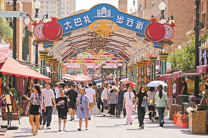8月22日,絡(luò)繹不絕的游客正在新疆國際大巴扎景區(qū)內(nèi)觀光游覽。巴扎,維吾爾語里是“集市”的意思。新疆國際大巴扎是烏魯木齊市著名地標性景點。這里聚集了3000余家商鋪,歡快的歌舞、香甜的瓜果、富有創(chuàng)意的“非遺”文創(chuàng)……游客在這里不僅能領(lǐng)略到豐富的特色商品和美食,還能了解新疆獨特的民俗風(fēng)情和多元文化,充分感受絲綢之路古今交融的獨特魅力。