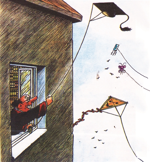 時(shí)下正是放風(fēng)箏的季節(jié),各式牽線的紙鳶爭(zhēng)奇斗艷,碧藍(lán)的天空頓時(shí)熱鬧起來(lái)。不甘寂寞的教授找出博士帽代替了“飛行器”。