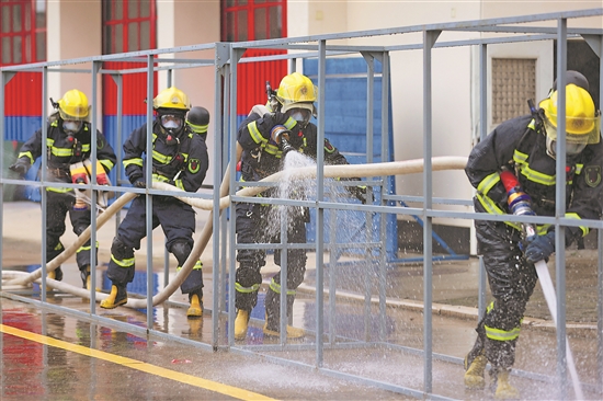 在福建廈門市集美區(qū)杏林消防救援站,俞建國(右二)與同事們進(jìn)行“縱深滅火救人操”訓(xùn)練。