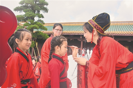 朱砂點(diǎn)痣、誦讀經(jīng)典……日前,近200名職工子女在福建省龍巖市武平縣總工會(huì)組織的暑托班里參加國(guó)學(xué)夏令營(yíng),體驗(yàn)“國(guó)學(xué)之禮”。