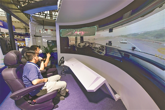 8月28日,工作人員在數(shù)博會(huì)上播放無人駕駛重型卡車上路行駛視頻。