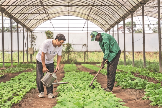 近日,在剛果(布)首都布拉柴維爾的中國援剛果(布)農(nóng)業(yè)技術(shù)示范中心內(nèi),中方農(nóng)業(yè)專家李科明(左)與當?shù)貑T工在大棚內(nèi)耕作。