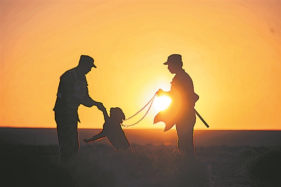 8月29日,護(hù)邊員在晨光下訓(xùn)練護(hù)邊犬。