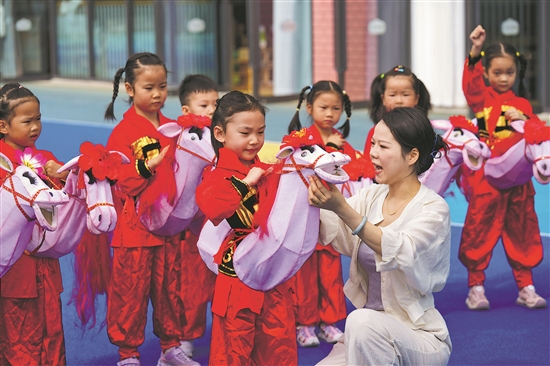 8月29日,在浙江省長(zhǎng)興縣開發(fā)區(qū)實(shí)驗(yàn)幼兒園,孩子們?cè)诶蠋煹闹笇?dǎo)下學(xué)習(xí)非遺下箬馬燈。本報(bào)通訊員 陳海偉 攝