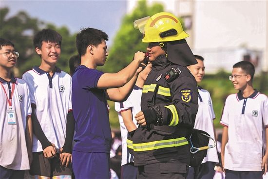 8月29日,湖南省道縣第二中學(xué),高一軍訓(xùn)學(xué)生在消防救援工作人員的指導(dǎo)下學(xué)習(xí)消防安全裝備穿戴。本報(bào)通訊員蔣克青 攝