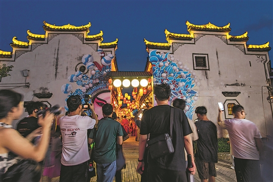 8月10日晚,在浙江省金華市金東區(qū)“歸鄉(xiāng)·坡陽夜肆”,游客們暢游古街,感受市井繁華。本報通訊員 胡肖飛 攝