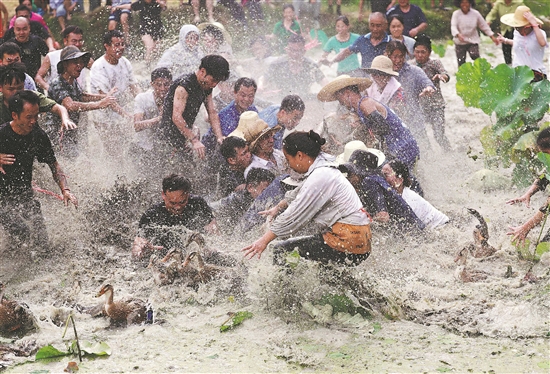 8月27日,在貴州省從江縣洛香鎮(zhèn)四聯(lián)侗寨,一場荷塘搶鴨摸魚活動正在舉行,吸引了眾多游客前來體驗。本報通訊員 梁輝波 攝