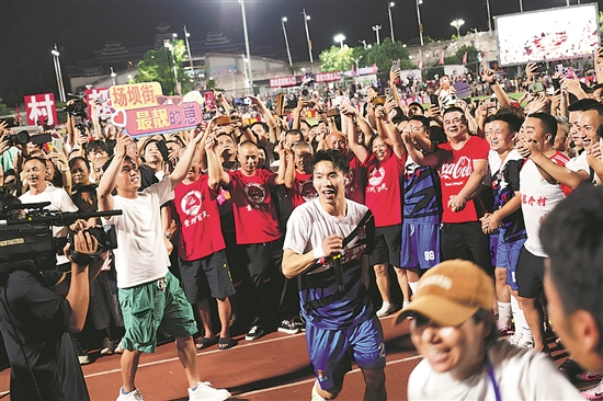 8月24日,在貴州省榕江縣,巴黎奧運會跳水男子雙人3米板冠軍龍道一在村超球場演唱自創(chuàng)歌曲《場壩街的崽》。本報通訊員 王炳真 攝