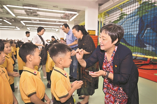 8月31日,北京第二實(shí)驗(yàn)小學(xué)校長(zhǎng)蘆詠莉(右一)在開(kāi)筆禮上為學(xué)生朱砂啟智。