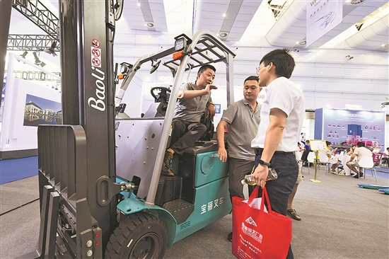 9月1日,在世界動力電池產(chǎn)業(yè)鏈供應(yīng)鏈成果展示活動現(xiàn)場,參展商向參會者介紹鋰電池平衡重式叉車。