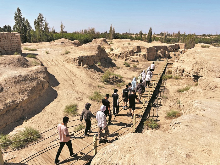 近日,新疆維吾爾自治區(qū)哈密市,游人正在拉甫卻克古城遺址游覽。