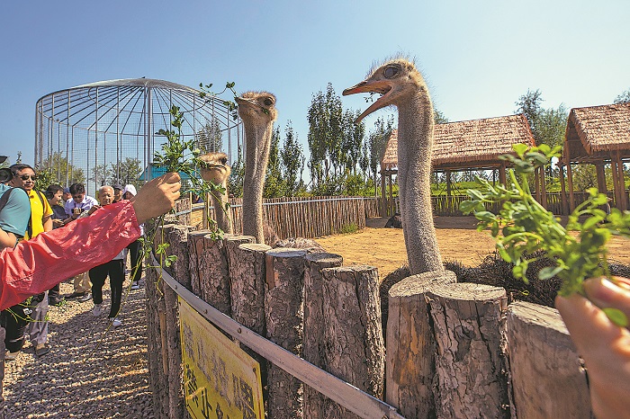 8月30日,位于內(nèi)蒙古自治區(qū)鄂爾多斯市準格爾旗的準能生態(tài)示范區(qū)毓秀景區(qū),游客們在復墾改造后的生物多樣性生態(tài)公園內(nèi)與鴕鳥互動。