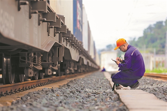 圖為近日,在老撾磨丁口岸車站,鐵路工作人員進(jìn)行檢查作業(yè)。新華社發(fā)(楊永全 攝)