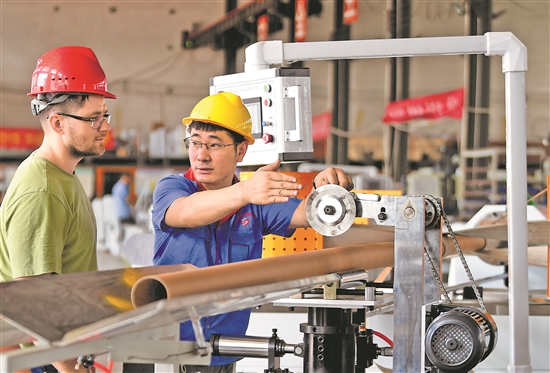 9月4日,在阜城縣碼頭鎮(zhèn)一家包裝機(jī)械制造企業(yè)生產(chǎn)車間,工人向外國客商介紹產(chǎn)品。