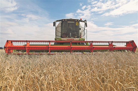 哈薩克斯坦北方多地9月進(jìn)入春小麥?zhǔn)斋@季節(jié)。據(jù)哈農(nóng)業(yè)部消息,截至當(dāng)?shù)貢r(shí)間9月3日春小麥?zhǔn)斋@面積已達(dá)300萬公頃。圖為近日,在哈薩克斯坦首都阿斯塔納附近的農(nóng)田,聯(lián)合收割機(jī)收獲小麥。新華社發(fā)(奧斯帕諾夫 攝)