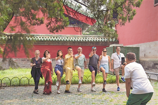圖為7月9日,來(lái)自意大利的游客在北京天壇公園體驗(yàn)太極拳后合影留念。