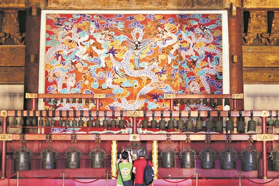 北京太廟享殿于近期恢復(fù)開放參觀,殿內(nèi)68根大柱皆為整根金絲楠木,最高的達(dá)13.32米,直徑最大的達(dá)1.2米,殿頂用片金瀝粉彩畫裝飾,地面墁鋪金磚。殿內(nèi)氣勢恢宏,在中軸線歷史建筑群體中極具代表性。
