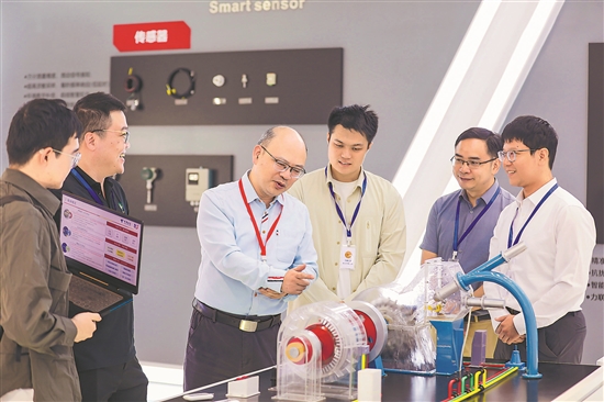 10月9日,位于福建省福州市閩侯縣的福建省力得自動化設(shè)備有限公司車間內(nèi),全國五一勞動獎?wù)芦@得者、福州市互聯(lián)網(wǎng)協(xié)會勞模工匠助企行服務(wù)隊隊長陳巧(左三)帶領(lǐng)隊員走進企業(yè),與青年技術(shù)工人互相交流、傳授技能。