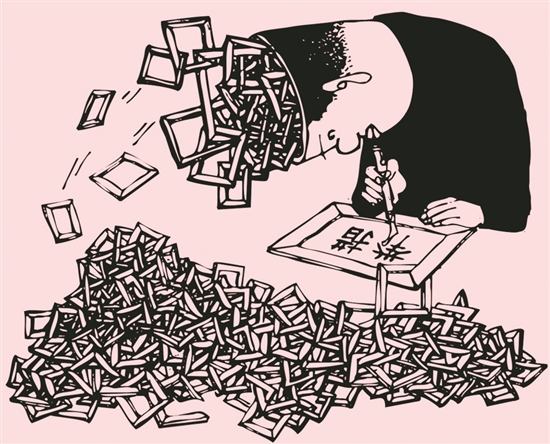 和“循規(guī)守矩”思維模式相比,逆向思維有助創(chuàng)新,比逆向思維更令人著迷的是發(fā)散性思維。這兩種思維類型,被漫畫家普遍應(yīng)用于構(gòu)思作品,有時延伸到完善和提高階段。走出條條框框,農(nóng)民的奉獻不僅僅局限于田野河塘,他們的身影可以當(dāng)之無愧地出現(xiàn)于酒店樓堂;走出條條框框,機關(guān)干部可以走出辦公室,他們的報表和總結(jié)可以直接寫在市民的臉上。無疑,這樣的作品更能撼動人們的心靈。