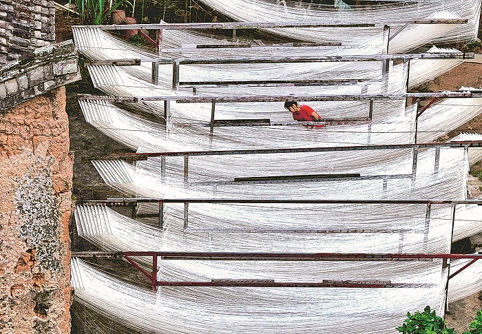 10月13日,福建省福州市閩侯縣荊溪鎮(zhèn)埔前村,村民在木曬架上晾曬線面。