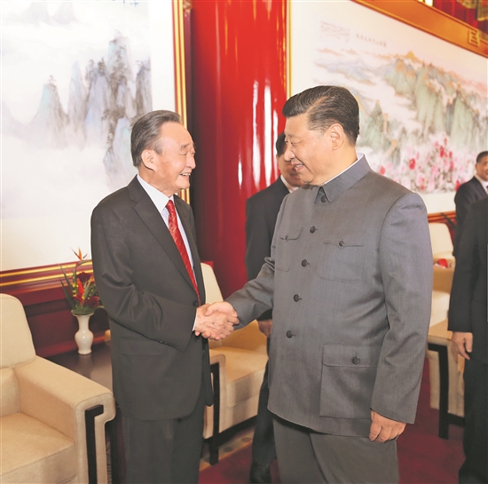 2021年7月1日,慶祝中國共產(chǎn)黨成立100周年大會(huì)在北京天安門廣場隆重舉行。這是慶祝大會(huì)前,習(xí)近平同志與吳邦國同志握手。新華社記者 鞠鵬 攝