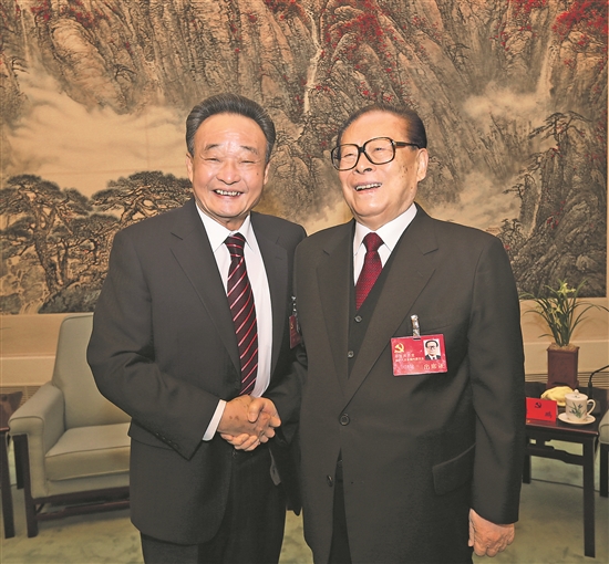 2012年11月14日,中國共產(chǎn)黨第十八次全國代表大會(huì)在北京閉幕。這是閉幕會(huì)前,江澤民同志與吳邦國同志在一起。新華社記者 蘭紅光 攝