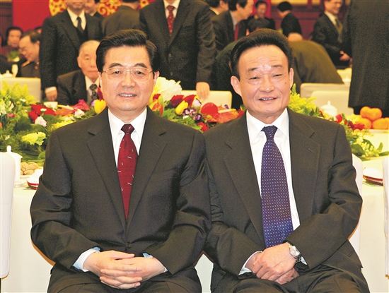 二〇〇五年一月一日,全國政協(xié)在北京舉行新年茶話會(huì)。這是胡錦濤同志與吳邦國同志在一起。新華社記者 樊如鈞 攝
