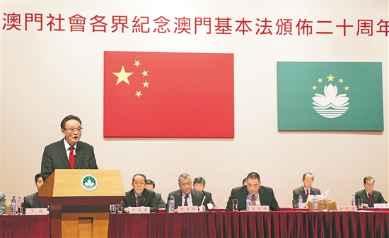 2013年2月21日,吳邦國同志在澳門文化中心出席澳門社會(huì)各界紀(jì)念澳門基本法頒布20周年啟動(dòng)大會(huì)并發(fā)表講話。新華社記者 鞠鵬 攝