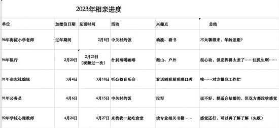 李建中制作的相親進(jìn)度表格。受訪者供圖