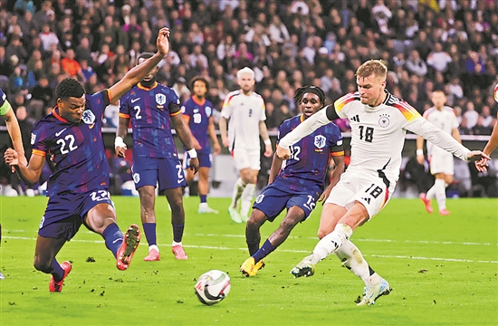 當(dāng)?shù)貢r(shí)間10月14日,在歐足聯(lián)歐洲國家聯(lián)賽A級(jí)聯(lián)賽中,德國隊(duì)主場1比0戰(zhàn)勝荷蘭隊(duì)。圖為荷蘭隊(duì)球員鄧弗里斯(左一)試圖封堵德國隊(duì)球員米特爾施泰特(右一)的射門。新華社發(fā)(菲利普·魯伊茲 攝)