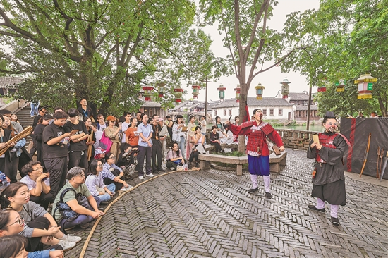 10月17日,游客在烏鎮(zhèn)街頭觀看古鎮(zhèn)嘉年華的演出劇目。