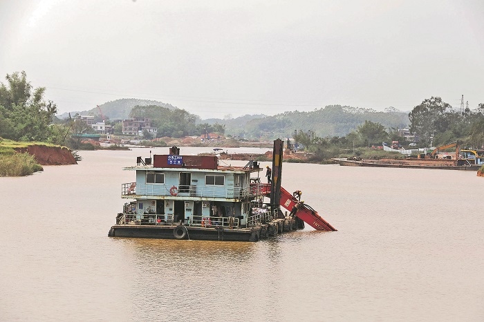 10月15日,在平陸運河馬道樞紐工程工地,工人正在人工清理運河底部軟性物質(zhì)。