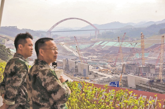 10月15日,在平陸運河馬道樞紐工程工地,當?shù)乜h政府工作人員遠觀施工現(xiàn)場。