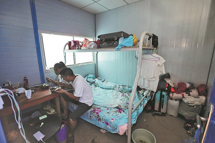 10月15日,在平陸運河青年樞紐工程工地,來自貴州的陳浩夫婦在工地提供的“夫妻房”里吃午飯。