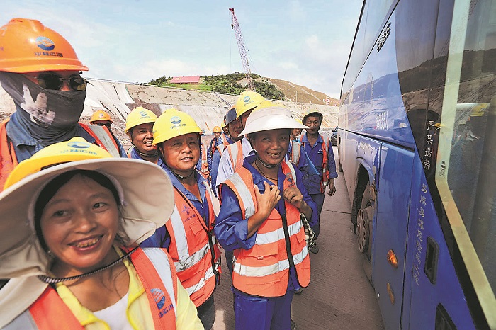 10月15日,在平陸運河青年樞紐工程工地,工人準備乘車回宿舍吃午飯。