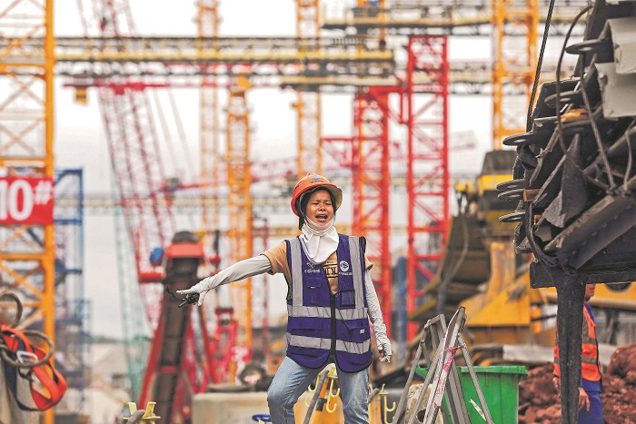 10月15日,廣西壯族自治區(qū)欽州市,在平陸運河青年樞紐工程工地,來自當?shù)氐?5歲司索工白煥英正在指揮塔吊進行吊裝作業(yè)。