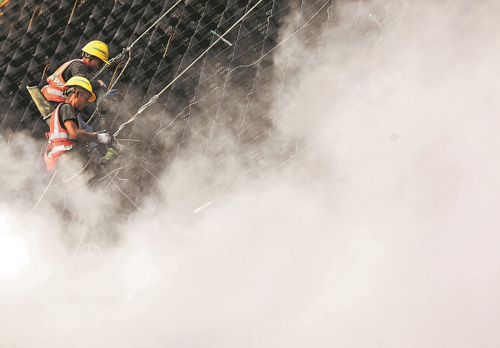 10月15日,在平陸運河馬道樞紐工程工地,霧炮車對施工道路噴灑水霧降塵。