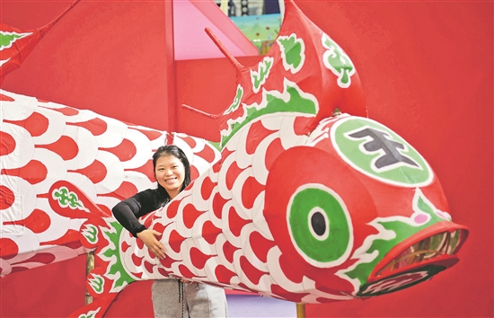 市民懷抱“汪滿田魚(yú)燈”拍照。張勇 攝/中新社
