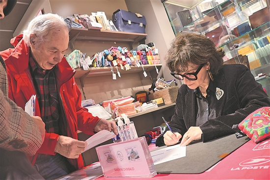 近日,在法國巴黎舉行的《中法建交六十周年》紀(jì)念郵票首發(fā)儀式現(xiàn)場,郵票設(shè)計者之一、法國藝術(shù)家桑德里娜·尚博為集郵愛好者簽名。新華社記者 張百慧 攝
