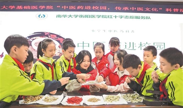 10月22日,在湖南省衡陽市蒸湘區(qū)實(shí)驗(yàn)小學(xué),南華大學(xué)衡陽醫(yī)學(xué)院紅十字志愿服務(wù)隊(duì)的志愿者教小學(xué)生們辨識中藥材。