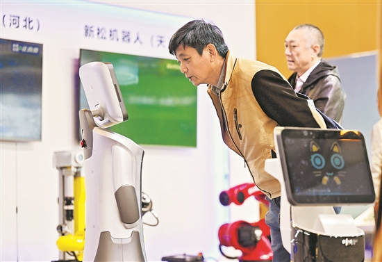 10月25日,在2024京津冀產業(yè)鏈供應鏈大會開幕式會場外設置的企業(yè)推介展區(qū),與會嘉賓與一款服務機器人互動。