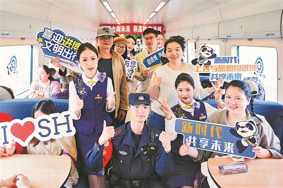 10月28日,在D3205次列車上,旅客與上??瓦\段乘務(wù)人員為進博會送上祝福。第七屆中國國際進口博覽會開幕在即,當日,鐵路上??瓦\段在D3205次列車上開展“心聚力向未來 乘高鐵迎進博”主題活動,向旅客介紹進博會亮點,為進博會送上祝福。